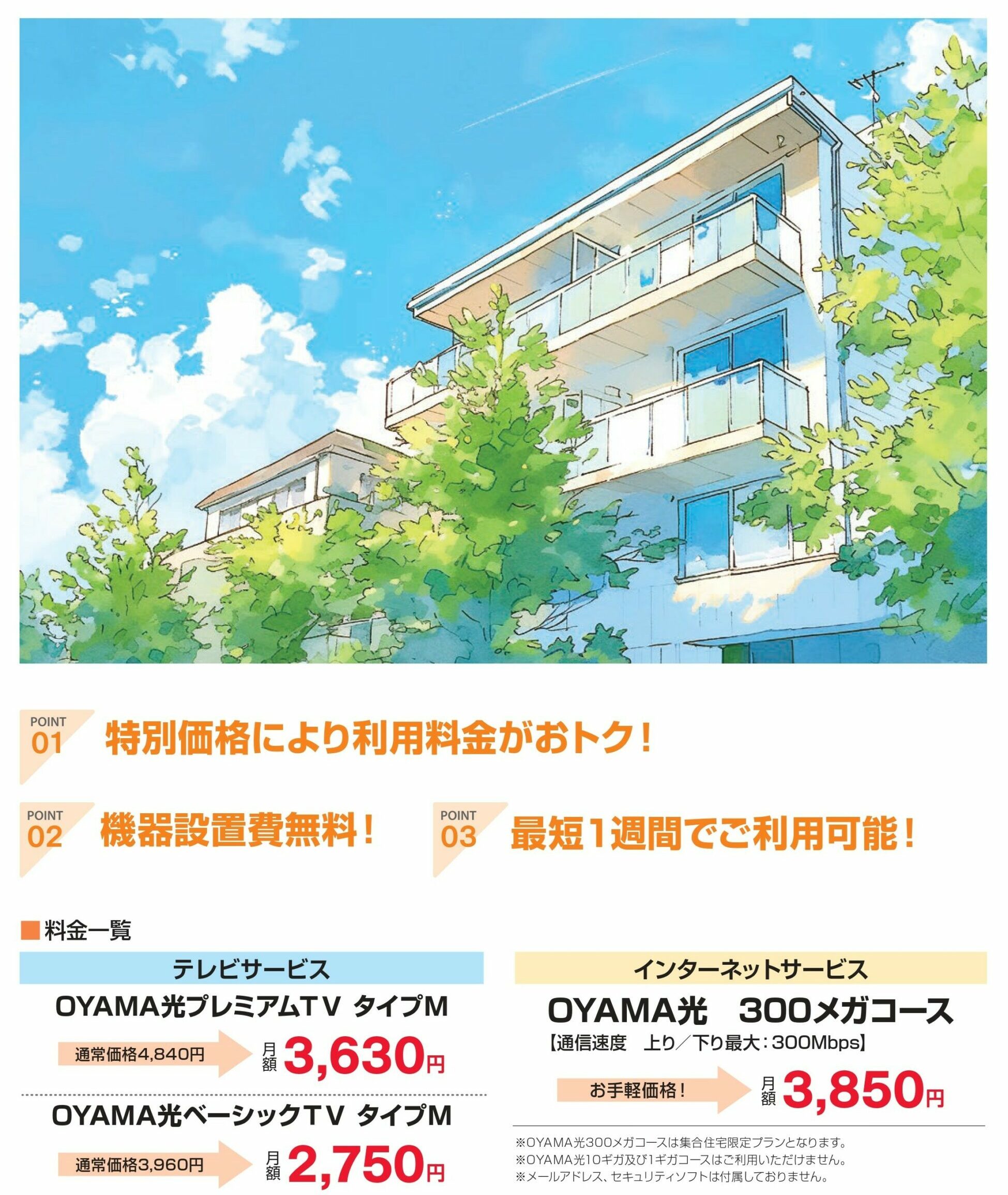 - 未対応集合住宅での単独引込導入の場合は登録料3,300円+工事費(各サービス毎39,600円)が必要となります。※工事費はキャンペーンにて実質無料となります。
